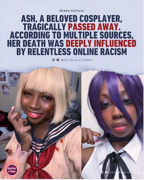 Taking a moment to remember Ash, a cosplayer who died by suicide this past November, by sharing some resources for getting help and support (below the image).